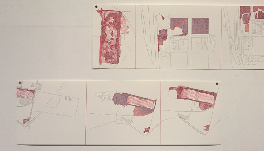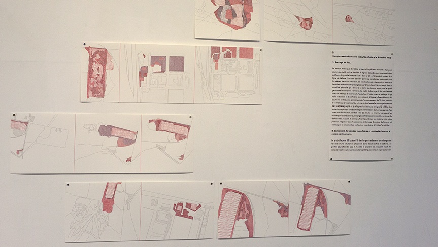Ce qui s’expose en rouge se définit comme ce qui porte possiblement des traces enfouies qu’on ne pourra retrouver mais où dort une mémoire désormais recouverte et matériellement inconnaissable: d’abord la butte de tir ou « butte aux chars », où 21 membre de la Commune ont été fusillées entre 1971 et 1873. Puis, l’étang de la Martinière, où des fosses communes ont été creusées en 1871. Enfin, le camp militaire lui-même, où, en 1871 quelques 20 000 personnes ont été internées. Rien de ces lieux ne gardant trace de ces événements du passé, le dessin d’observation fait alors ressurgir ce qui sur le terrain, ne saurait s’apercevoir et que seule l’interprétation graphique permet de formaliser.
