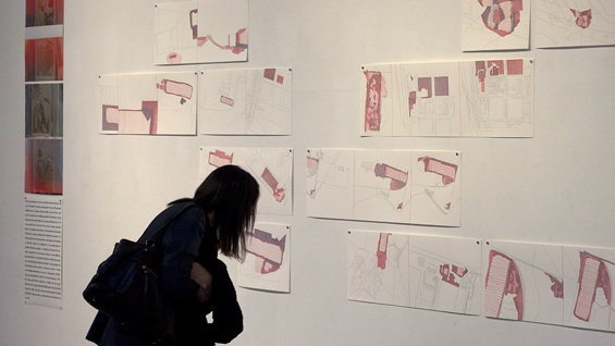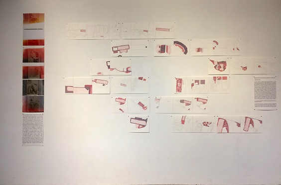 Dans l’exposition, l’horizontalité des 6 strates de dessins, telle une coupe de temps stratifiés, fait contrepoint à la verticalité des 3 doubles photogrammes (6 en tout) et des textes, qui éclairent de leur présence fantomatique et mémorielle cette recherche plastique et géographique apparentée à une quête d’architecture forensic.